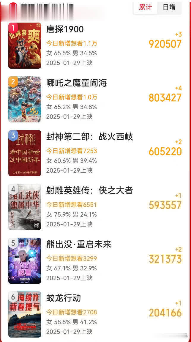而前三甲轮番为《唐探1900》《哪吒之魔童闹海》和《封神第二部:战火西岐》,齐是续集、齐是备受期待的大片,也齐是背后有强悍的宣发公司和回山倒海的宣传。而第四位的《射雕骁雄传:侠之大者》不上不下,又一次施展顶流明星就那么回事儿,肖战需要在盛典上比嘘控场,安抚粉丝,却莫得概念在全民参与的“想看”指数上拔得头筹。