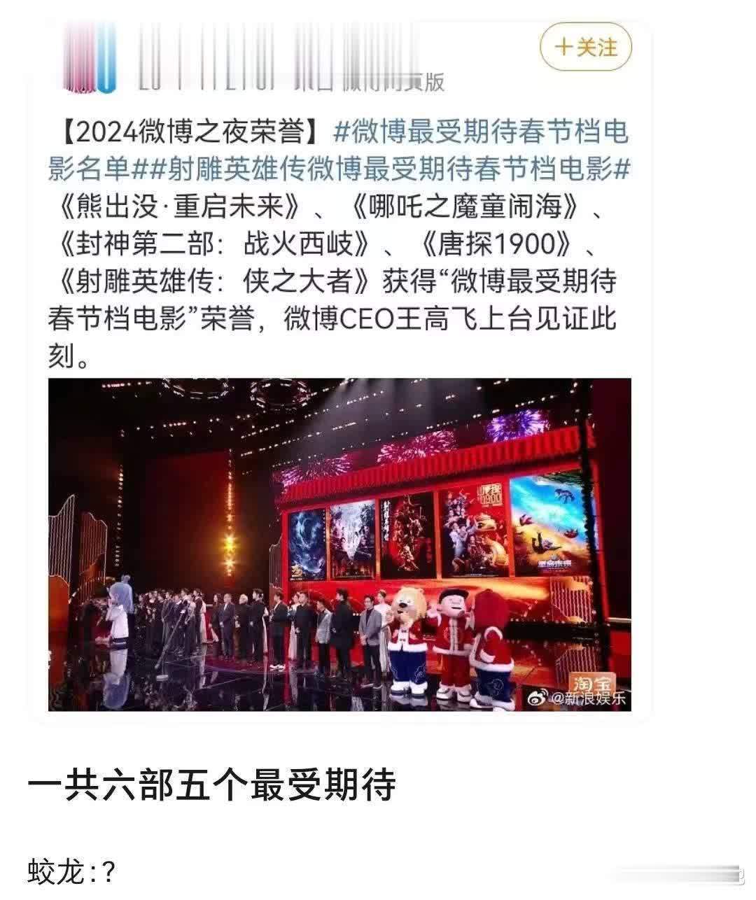 除了宣发力度不够、想看没作念上去,《蛟龙活动》的线下宣传也掉队了。别的不说,微博之夜这样阻难的宣传平台,“最受期待的春节档电影”这一项,其他五部电影齐有了,唯有莫得《蛟龙活动》,这公关怎么作念的?钱是不是没花到位?怎么给行业信心?