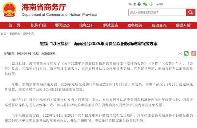 不外,2024年12月31日,海南省商务厅发布《对于2025年奢侈品以旧换新策略相连责任安排的公告》,明确暗示平直延续2024年以旧换新策略,直到2025年出台新的策略。此外,湖南,辽宁,河北,湖北,贵州以及广西壮族自治区等均已出台相关策略。不外,各地的策略详情有所互异,详情可检察各地商务厅发布的音讯。