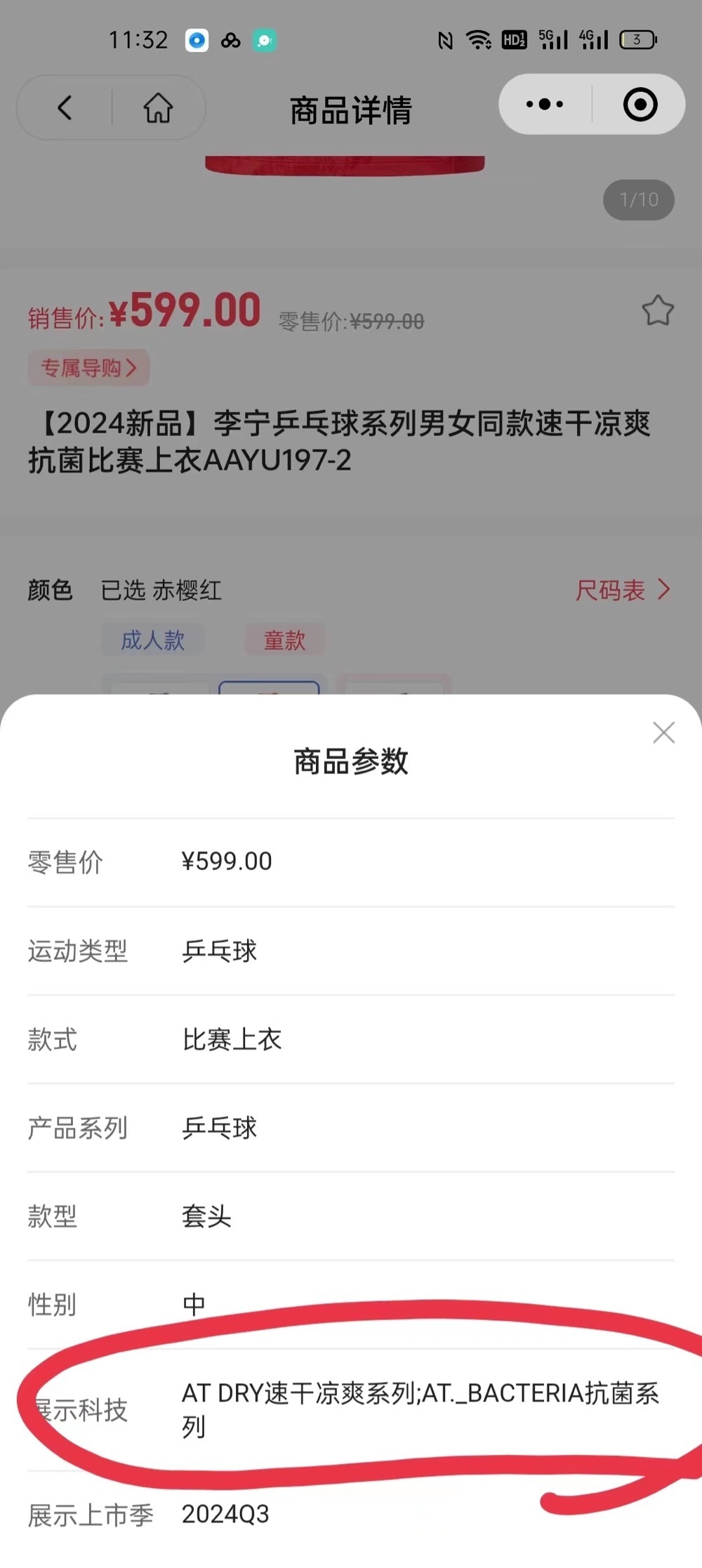 这款被称为“2024龙服”的李宁乒乓球系列男女同款如今也在李宁官方旗舰店微信小才气售卖,成东谈主售价599元,童款187元,表明为速干寒冷抗菌比赛上衣。