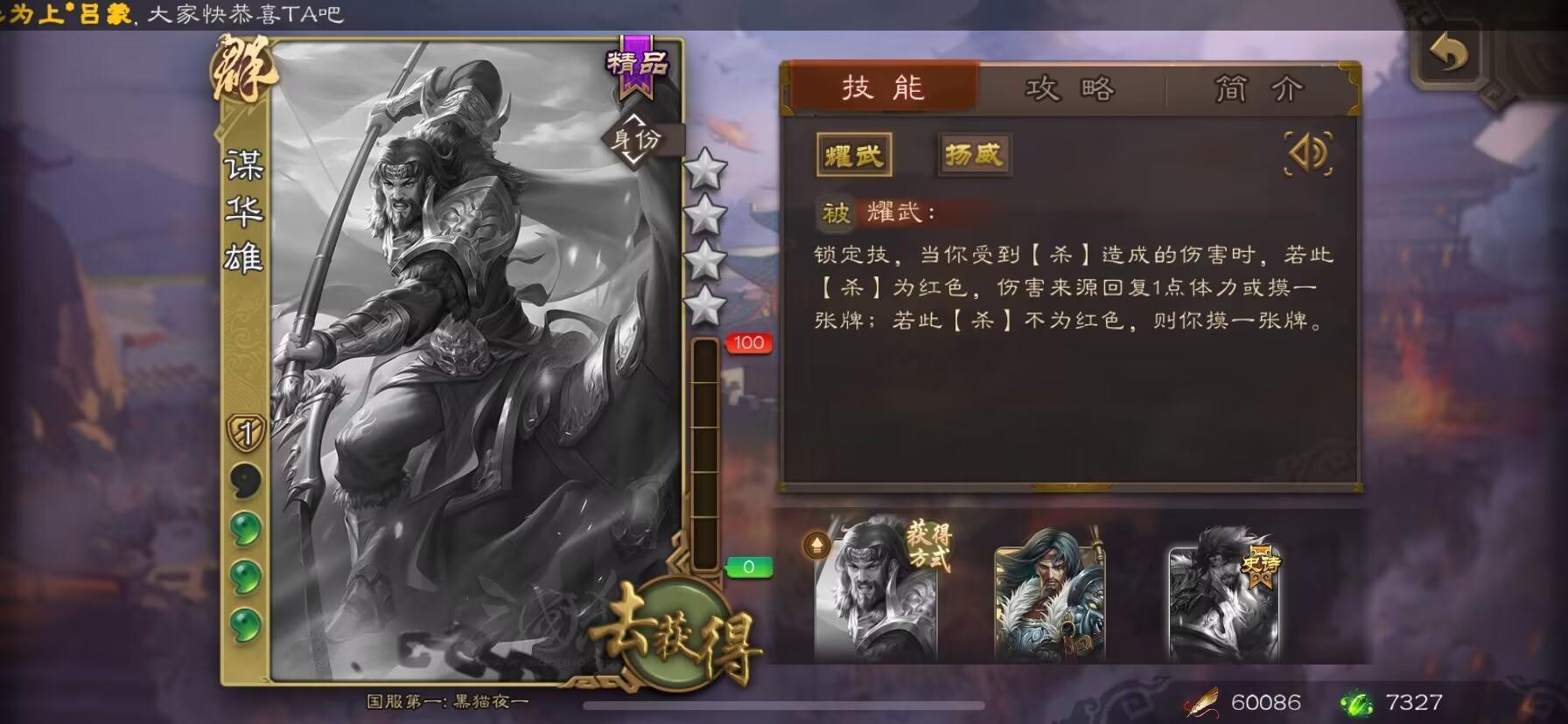 这波谋华雄可谓史诗级加强,除了耀武照旧那么废料之外,不外这亦然华雄的经典牌号妙技了,去掉这个妙技我还认不出了。