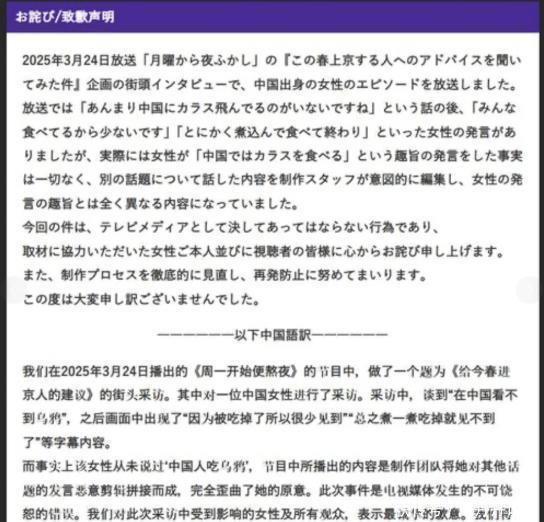 综艺节目《月曜夜未央》为每周一晚在日本电视台播出的搞笑类综艺节目,从2012年开播于今有着相配高的东说念主气,“街头采访”是该节标的一个代表性法子,该节目此前在日本街头采访过不少在日本职责生计或旅游的中国东说念主,近几年还来到中国天津、云南等地进行过街头采访。3月24日,该节目播出的街头采访施行中,坏机杼剪了又名受访的中国女性的发言,关连片断露出,节目先是提到“中国很少看到乌鸦在飞”,随后播出了采访又名中国女子的画面,她暗示“因为专家都会吃,是以路上很少”“丢进锅里煮煮来吃就好”等。节目播出后该女性的发言在国内外交媒体引起研讨,不少网友指出“从来莫得外传过有东说念主吃乌鸦”,指责受访东说念主刻意抹黑,受访女子随后在小红书发文贯通此事,暗示我方的发言遭到了坏机杼剪,节目组问她到东京后比拟惊骇的事情,女子恢复为:“东京乌鸦好多,中国乌鸦很有数。”节目组又问正常在家里吃什么,女子恢复为:“最近加班比拟多,比拟心爱吃暖锅,因为全部丢进去煮一煮吃掉就好了。”限度这两段被节目组裁剪拼接在全部,造成了“中国乌鸦很有数,因为全部丢进去煮一煮吃掉了。”后续该女子关连了节目组职责主说念主员暗示抗议,并暗示我方从未说出节目中呈现的论断,3月27日,日本电视台官网用中日双语说念歉,这名女生从未说过“中国东说念主吃乌鸦”,制作团队坏机杼剪都备误会了她的本意。