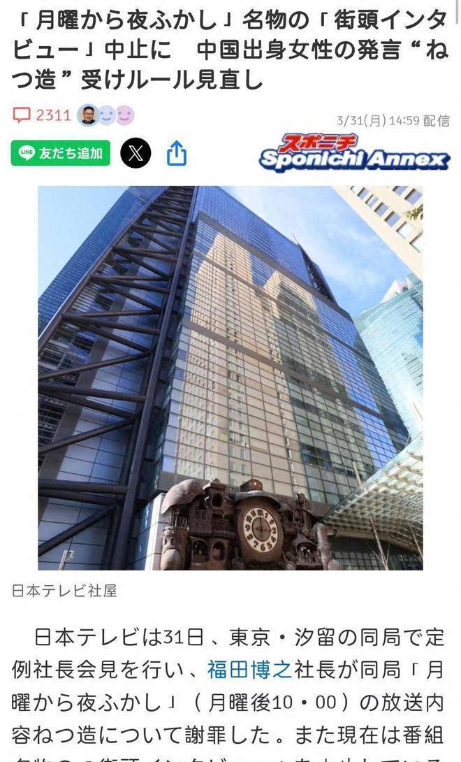 3月31日,日本电视台在总部举行例行的社长记者会,社长福田博之就近几日发生的该电视台着名综艺节目《月曜夜未央》播出施行申斥“中国东说念主爱吃乌鸦”一事进行说念歉,并暗示将暂停该节标的代表性节目法子“街头采访”,并重新凝视节目制作历程,“咱们会进行事实证据和原因探听,透顶重新凝视节目制作历程,确保此类事件不再发生,并合营新的挨次来驻防问题再次出现。”