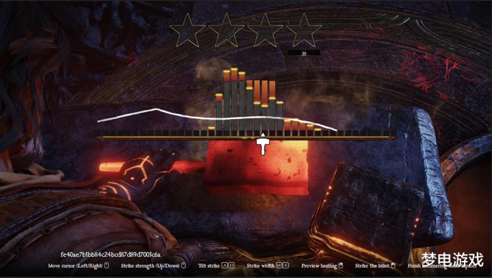临了一步则是捶打成形,在游戏中的这一过程制作组策画了一个小游戏。看起来像音游的界面,玩起来大不同,需要傍边转变位置,让条形图和弧线尽可能的区域一致,越接近敲击的分数越高,没敲好进程还下跌,每次敲击玩齐会变化。最高能有四颗满星,星越多兵器品性就越高,然后有个敲打的次数范畴。兵器就能成行,带入践诺宇宙中构兵。