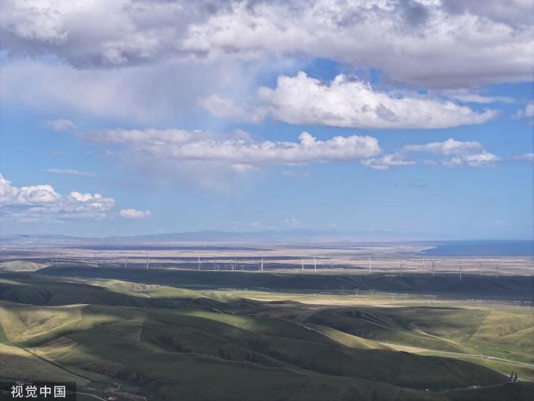 青海省海北藏族自治州刚察县夏令草原秀丽征象航拍。